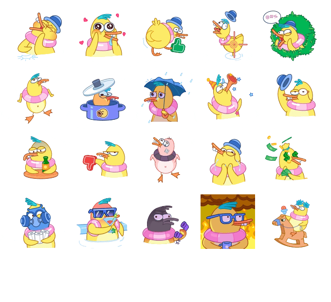여기 가익이라고 불리는 아주 재미있는 노란 오리에 대한 멋진 텔레그램 스티커 세트가 있습니다. 그는 보통 파란색 볼러 모자와 분홍색 구명 벨트를 목에 걸고 다닌다.