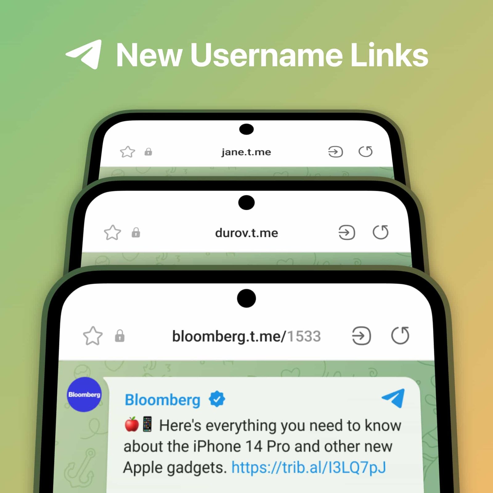 이제 모든 사용자명은 자신의 이름을 강조하고 싶은(또는 / 키를 찾는 데 어려움이 있거나) 사용자를 위해 새로운 고유 링크 형식인 사용자명.t.me를 소유하게 됩니다.