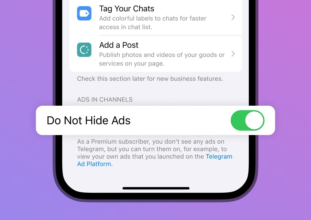 기본적으로 텔레그램 프리미엄을 구독하면 채널에서 광고가 숨겨집니다. 내 광고를 확인하거나 채널이 보상을 받는 것을 돕고자 광고를 계속 보고 싶다면, 설정 > 텔레그램 비즈니스에서 스폰서 메시지를 표시하는 새로운 토글이 있습니다.